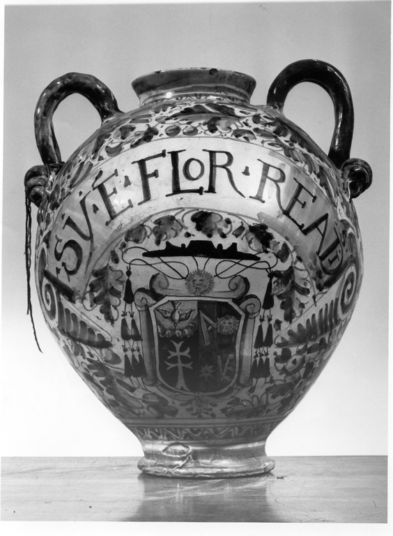 L'orcio presenta due anse e una decorazione di vegetali con cartiglio in alto e scritta al centro