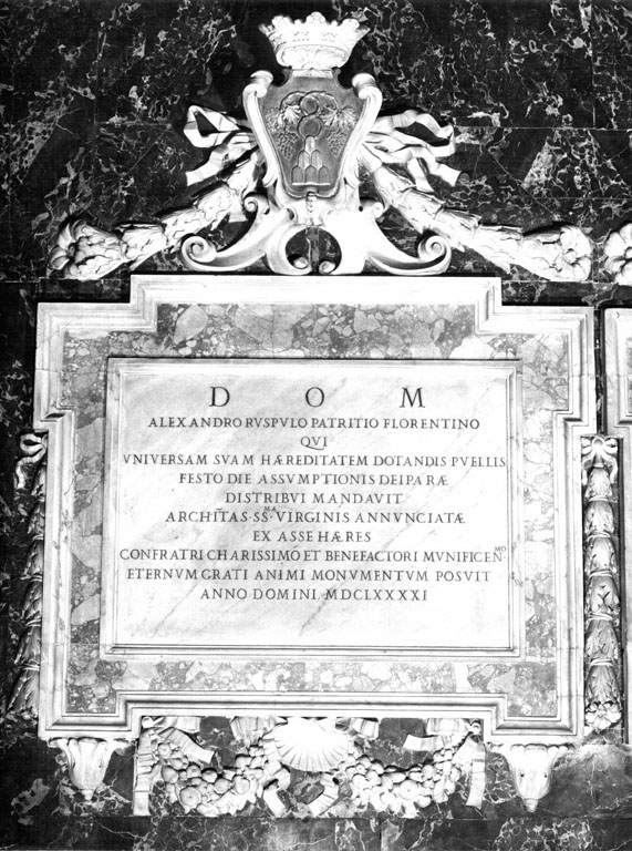 cornice spezzata e modanata su mensole fitoforme. Racchiude lastra rettangolare con iscrizione, dal profilo modanato. Motivi a rilievo: in basso da conchiglia centrale partono festoni di frutta; ai lati pendono festoni vegetali. In alto e' lo stemma entro fastigio con corona, volute, nastri e cornucopie