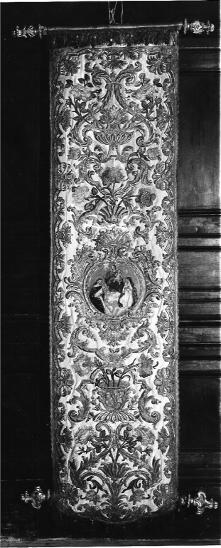 Drappo: lato inferiore leggermente sagomato. Recto: campo avorio in seta ricamato a rilievo con volute, vasi e motivi floreali disposti simmetricamente intorno al medaglione centrale. Due aste con le punte dorate e decorate a volute tengono la banda