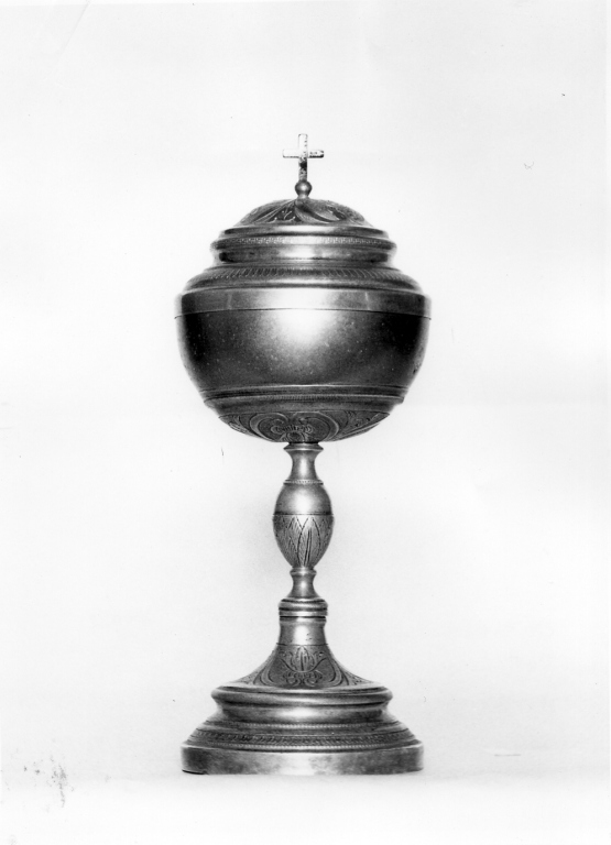 Base circolare; piede sagomato a modanature; fusto con nodo ovale decorato a foglie lanceolate; sottocoppa con decoro a volute e foglie; coppa liscia; coperchio avente sulla calotta analogo decoro della sottocoppa e croce apicale