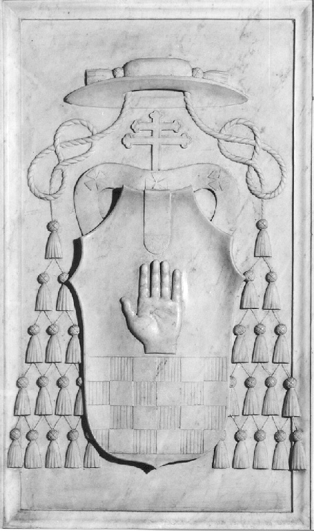 busto maschile, sarcofago con volute e cherubini, coppia di putti, alto architrave, lastra rettangolare, specchiature, coppie di stemmi, cornici modanate