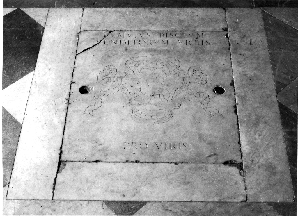 - NOTIZIE STORICO CRITICHE Si tratta della lapide sepolcrale per gli uomini dell'Università dei Pescivendoli, la cui collocazione nel pavimento della cappella fu concessa dal Capitolo di S. Angelo il 27 febbraio 1579 (BAV, Arch. S. Angelo in Pescheria, v. II 8)