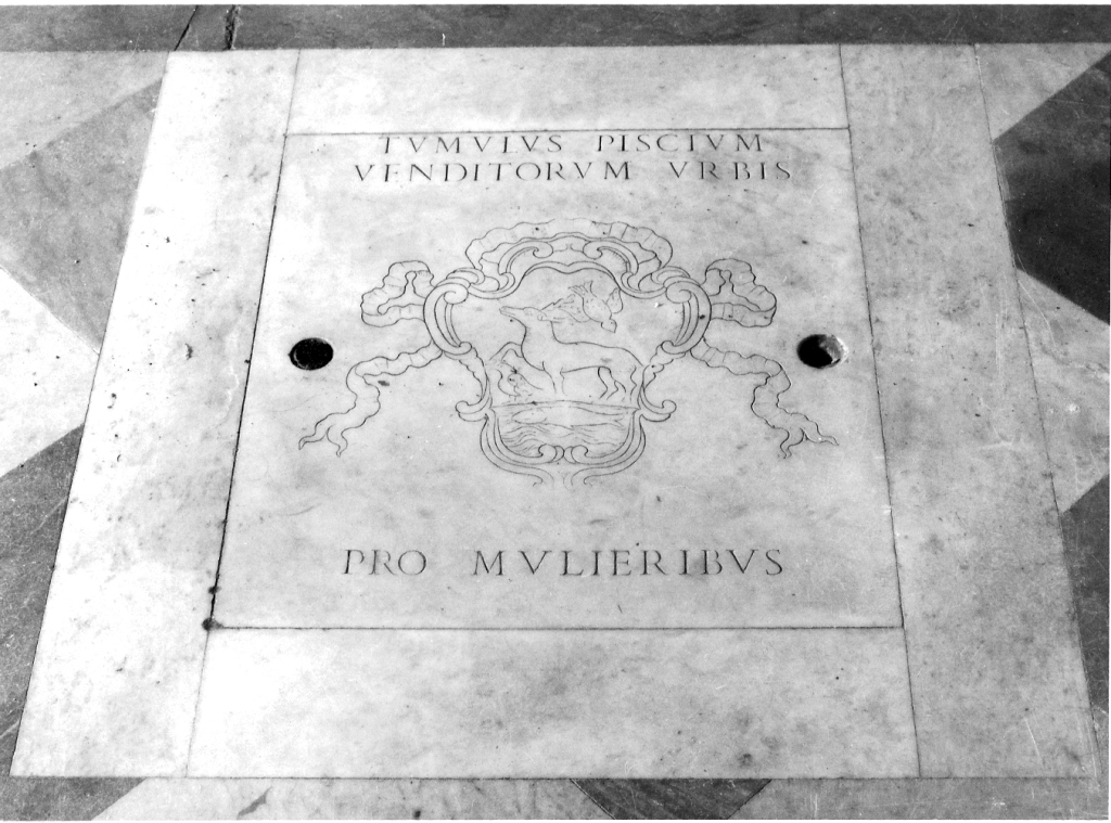 - NOTIZIE STORICO CRITICHE Si tratta della lapide sepolcrale per le donne dell'Università dei Pescivendoli, la cui collocazione nel pavimento della cappella fu concessa dal Capitolo di S. Angelo il 27 febbraio 1579 (BAV, Arch. S. Angelo in Pescheria, v. II 8)