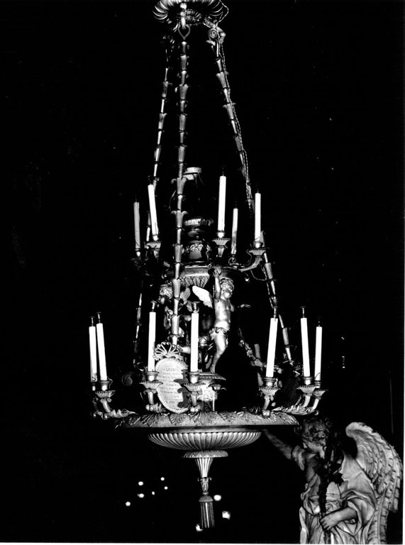 lume costituito da due piatti sovrapposti su cui si innestano bracci reggicandela fitomorfi. Il piatto inferiore, retto da tre steli liliacei raccordati al gambo principale mediante nodo decorato a foglie lanceolate, e' ricoperto da motivi fogliacei, presenta sottopiatto baccellato da cui pende una nappa metallica. Su margine del piatto sono tre targhe, una con iscrizione, una con stemma del committente e l'altra con monogramma gesuitico. Il piatto superiore e' retto da tre angioletti