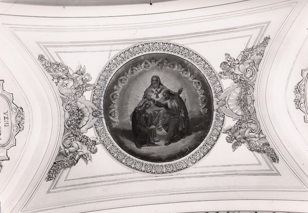 Dipinto entro cornice simulante motivi a palmette in stucco. Il Cristo seduto, con in mano lo scettro, incorona la Vergine, illuminata dalla colomba dello Spirito Santo. In secondo piano la figura dell'Eterno Padre, con le braccia aperte, accompagna lo svolgimento della scena. Una cornice semicircolare di cherubini inquadra la scena