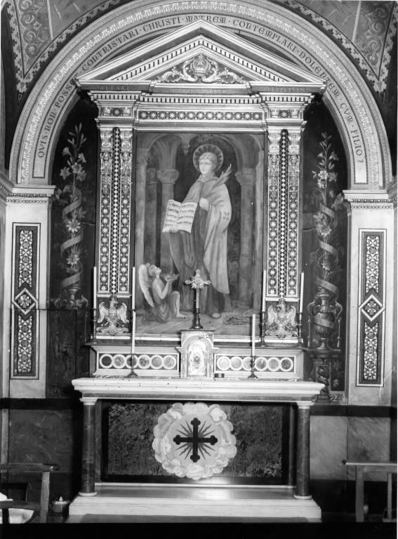 Altare inserito entro arcata decorata da iscrizione su fondo a finto mosaico, al centro coppie di lesene dipinte, e timpano con inserti in stucco dorato e dipinto in olio su muro raffigurante personaggio maschile in abiti religiosi caratterizzato da libro, palma, aureola, ai suoi piedi angelo inginocchiato con corona e alle sue spalle colonnato. Gradini, mensa con colonnine e paliotto in marmi colorati