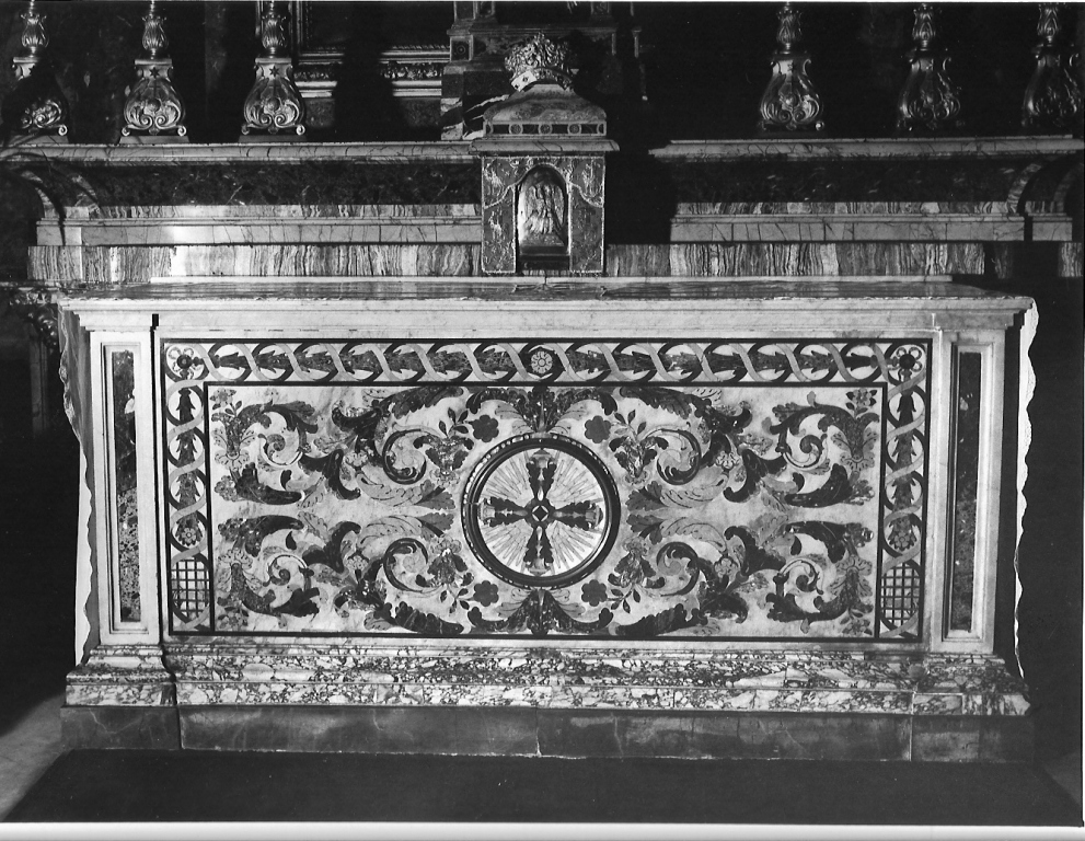 Commesso di marmi policromi e madreperla. Decorazione: al centro, croce raggiata entro un cerchio circondato da girali vegetali e fiori. Sui bordi laterali e superiore ghirlanda avvolta da doppia spirale. Alle estremità laterali due pilastrini aggettanti