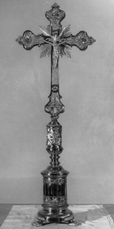 Base cilindrica su piedi leonini, modanata e decorata da fogliame. Fusto con nodo cilindrico ornato sulla fronte da una palmetta entro un ovale. La croce ha i bracci con fondo granito e terminazioni trilobe fitomorfe; agli angoli partono fasci di raggi che incorniciano il Cristo, a sua volta fornito di aureola raggiata