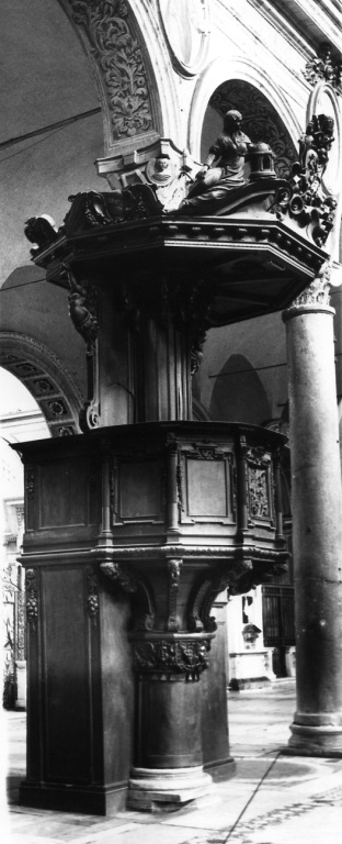 Plinto a sezione quadrata; base attica; fusto in granito bigio, liscio e rastremato; capitello corinzio figurato, articolato con busti entro clipei, collocati in posizione centrale o angolare. La colonna a sinistra è inglobata nel pulpito ligneo
