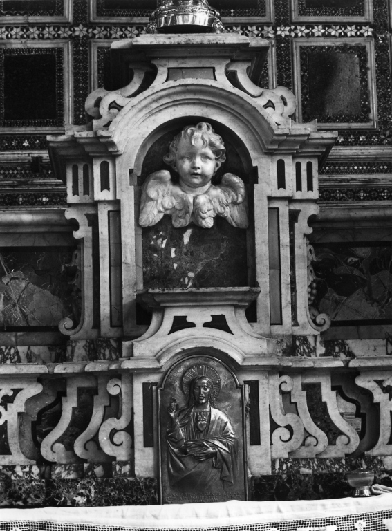 Gradino a doppio ripiano con volute laterali in marmo banco e partizioni vertiali mistilinee, che separano le formelle di marmi policromi, incorniciate da filetti in marmo nero e inquadrate da fasce orizzontali di pavonazzetto e granito verde. Al centro , affiancato da volute è posto il tabernacolo con sportello argenteo sbalzato e dorato con l'immagine del Redentore benedicente, sormontato da un'edicola centinata e profilata da volute, all'interno della quale è collocato un cherubino in marmo bianco