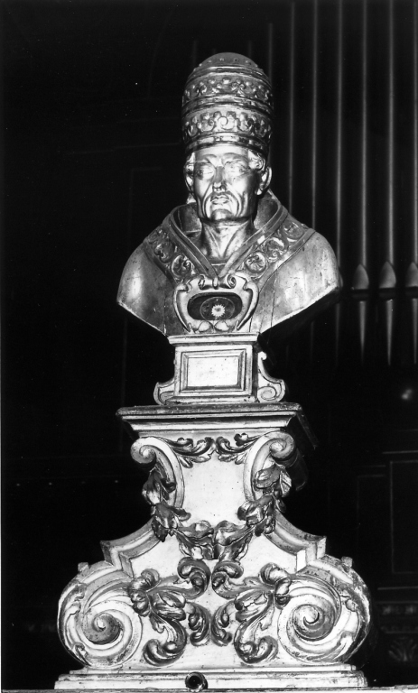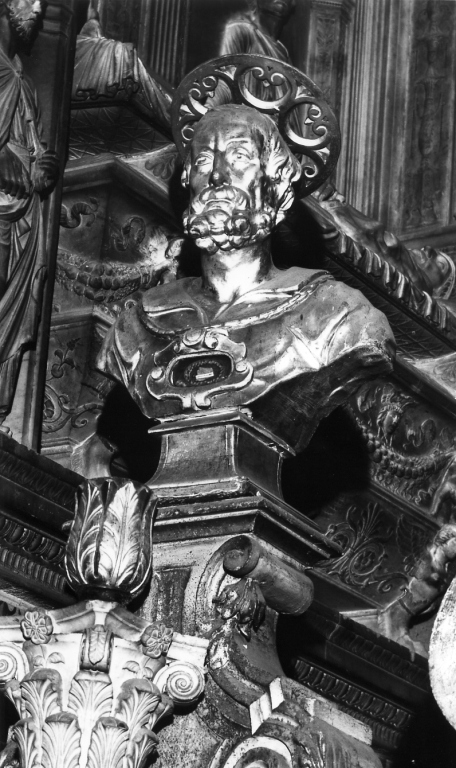 - NOTIZIE STORICO CRITICHE Un'iscrizone che corre sul lato posteriore delle basi che sostengono sia i reliquiari che le statue di San Bernardino e di San Giovanni da Capestrano, ricorda l'anno di realizzazone del recinto ligneo (1691) e quello di un restauro del 1829. In analogia con le statue, ricordate da Casimiro da Roma, anche i reliquiari sono considerati coevi al recinto, che venne realizzato durane il guardianato di fra' Vincenzo da Bassiano, conclusosi appunto nel 1691 (Carta/ Russo, 1988).Tuttavia a rigore questa data compare solo sulle basi delle statue e i caratteri epigrafici di tutta l'iscrizone lasciano qualche dubbio sulla sua attendibilità. Sembra probabile che i busti fossero previsti nel recinto seicentesco, posti sulle basi di appoggio, che sono solidali alla struttura; in ogni caso essi sono segnalati in un disegno della Biblioteca Albertina di Vienna databile al 1724 - 1725, quindi a quest'epoca erano comunque stati colocati in situ