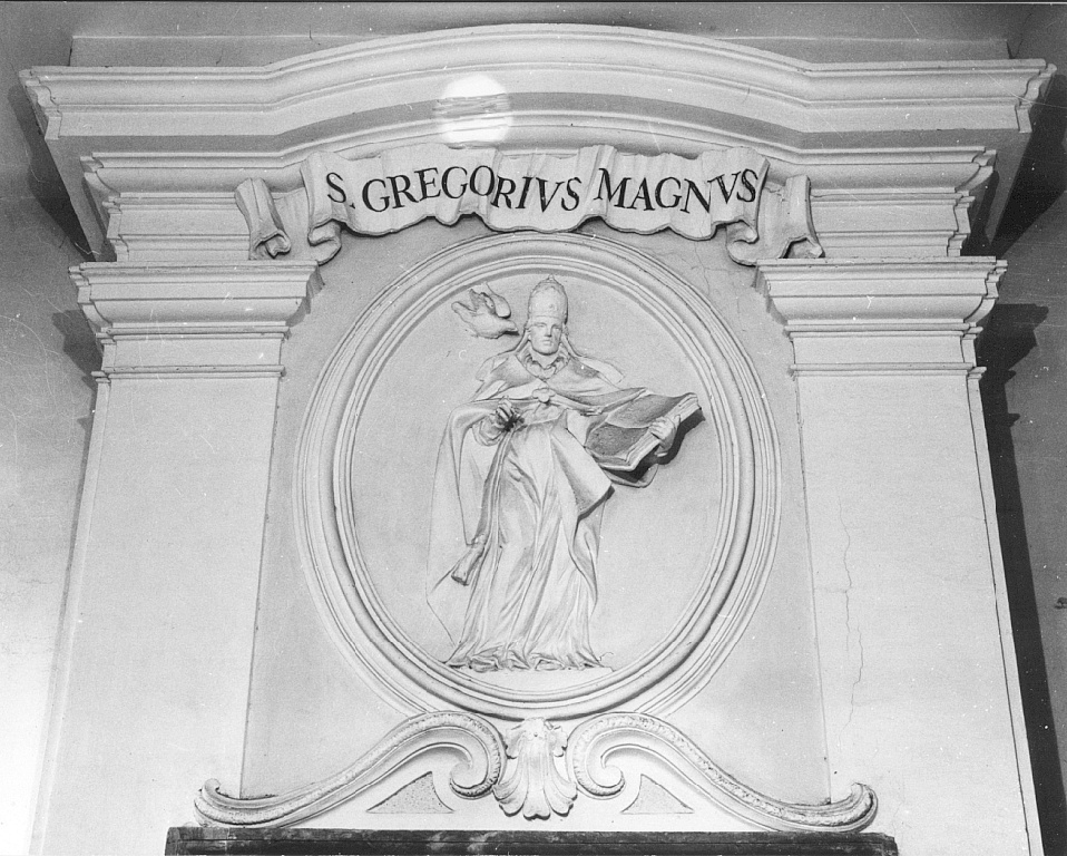 - ISCRIZIONI nel cartiglio sopra la statua - S. GREGORIVS MAGNVS - Porziani Carlo//Ferrari Filippo - lettere capitali - a pennello - latino