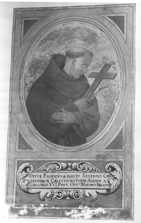 Il religioso è raffigurato in piedi in abiti francescani con in mano una croce