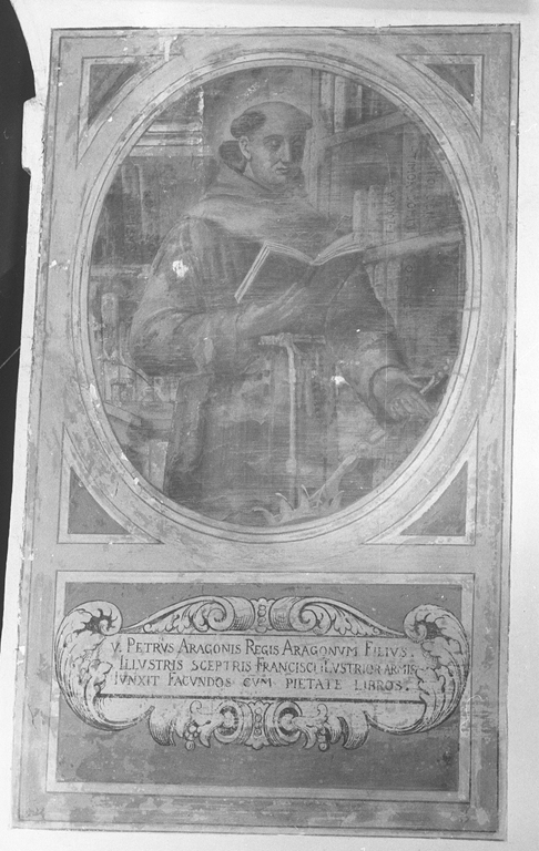 Il religioso è raffigurato in piedi all'interno di una biblioteca mentre è intento nella lettura di un libro. Nell'altra mano uno scettro