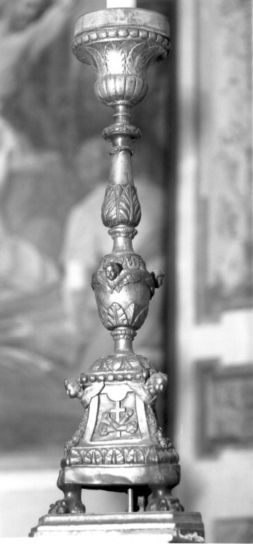 Base a sezione triangolare poggiante su piedi leonini, fusto a forma di campana con emblema francescano e tre cherubini sul bordo superiore. Il nodo centrale ha una decorazione a foglie e cherubini in nrilievo. Nei candelieri il fusto si rastrema per poi allargarsi a forma di campanula. Nella croce l'ultimo nodo è occupato dalla croce con Crocifisso