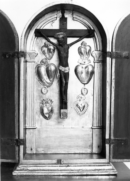 base modanata su cui poggia teca a forma di piccola pala centinata con due ante con cerniera decorate con simboli della passione; all'interno crocifisso con Cristo con perizoma, ai lati ex voto