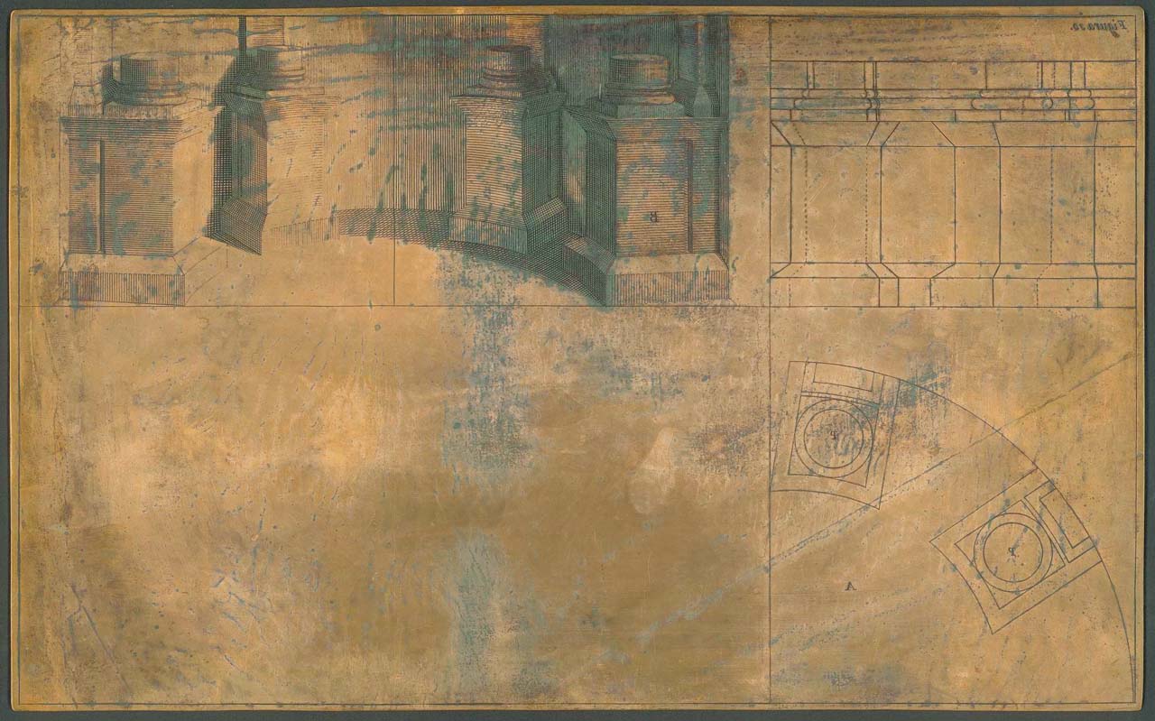 Quattro Piedistalli in mezzo circolo, dove si da' un'altro documento. quattro piedistalli in una nicchia in proiezione ortogonale e prospettica