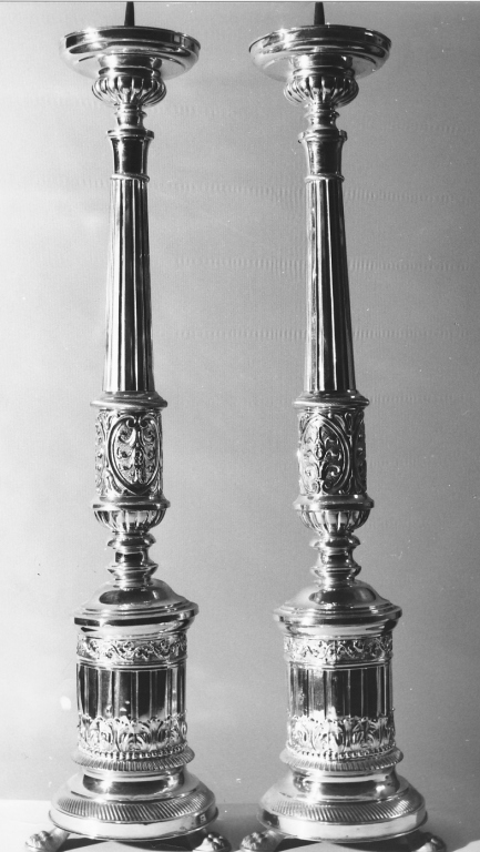 base circolare sagomata, sorretta da tre piedini a zampa leonina e con cilindro scanalato, decorato da fascia di foglie d'acanto in basso e da nastro vitineo in alto; fusto a balaustro scanalato con nodo a rocchetto; bocciolo baccellato; piattello liscio e modanato; sgocciolatoio; puntale