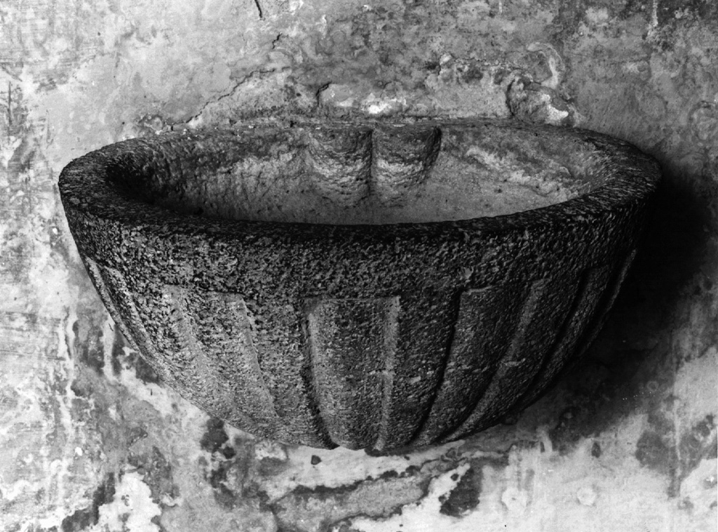Acquasantiera con catino scanalato e due volute in corrispondenza dell'incasso nella muratura