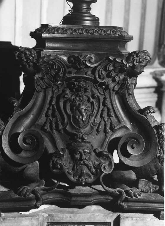 su basamento marmoreo. Base a sezione triangolare con piedi a foma di leone e decorata da stemma centrale tra volute ai lati, mascherone in basso e teste cherubiche in alto. Fusto a balaustro con nodo a vaso tra due rocchetti e ornato da fogliette lanceolate. Piattello circolare