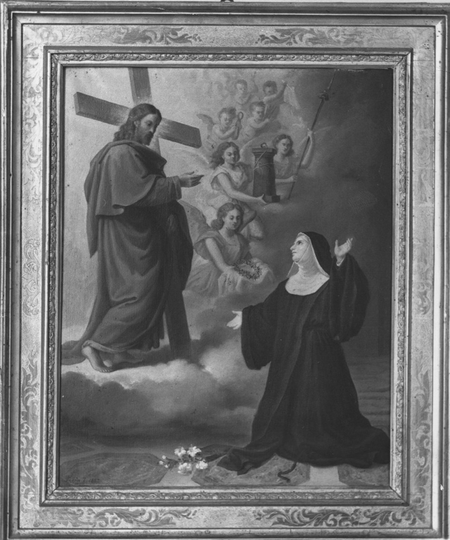 personaggi: Gesù Cristo. Figure: monaca francescana; angeli. Simboli della Passione: croce; corona di spine; colonna; lancia