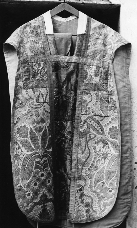 La stola fa parte di un paramento liturgico che comprende anche una pianeta e una piviale. In broccato di seta a fondo bianco tramato d'oro, con motivi vegetali diversi ricamati in filo d'oro