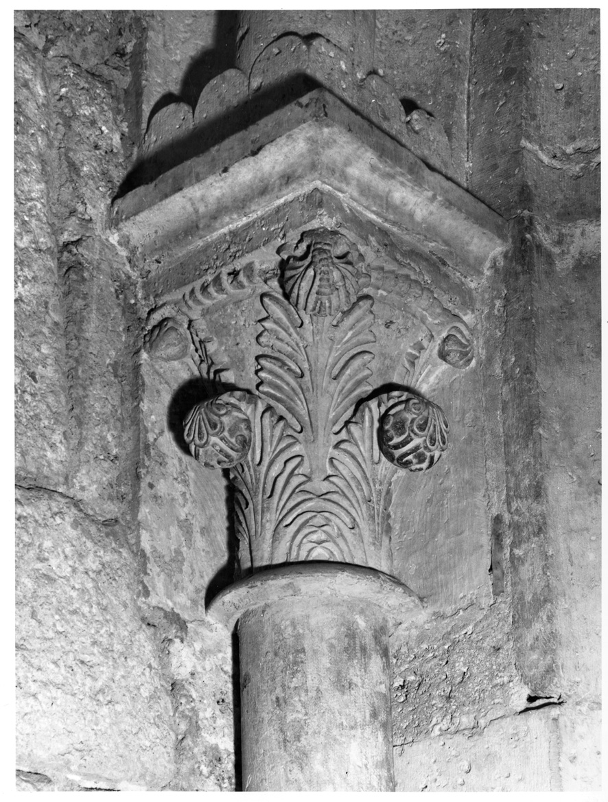 Colonnina angolare con capitello su cui si imposta l'arco interno di accesso al corridoio per il giardino: il fusto è in marmo, il capitello, in pietra calcarea, è a doppio giro di foglie terminanti a caulicoli