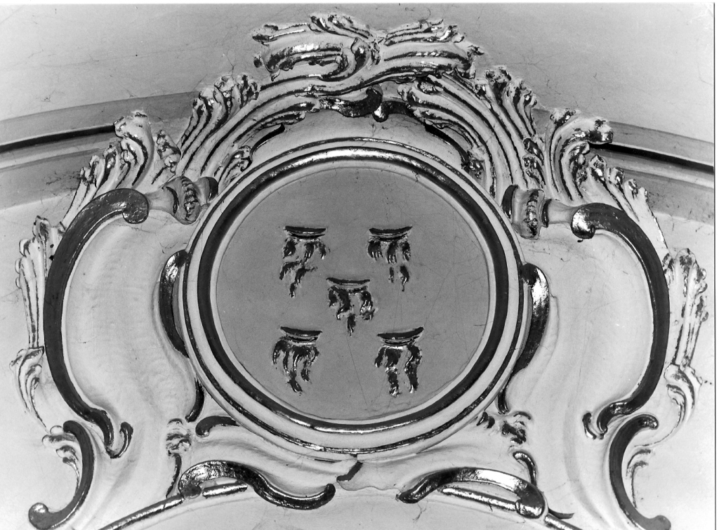 Lo stemma in stucco dipinto e dorature è decorato a volute e presenta nel tondo centrale le stimmate di San Francesco