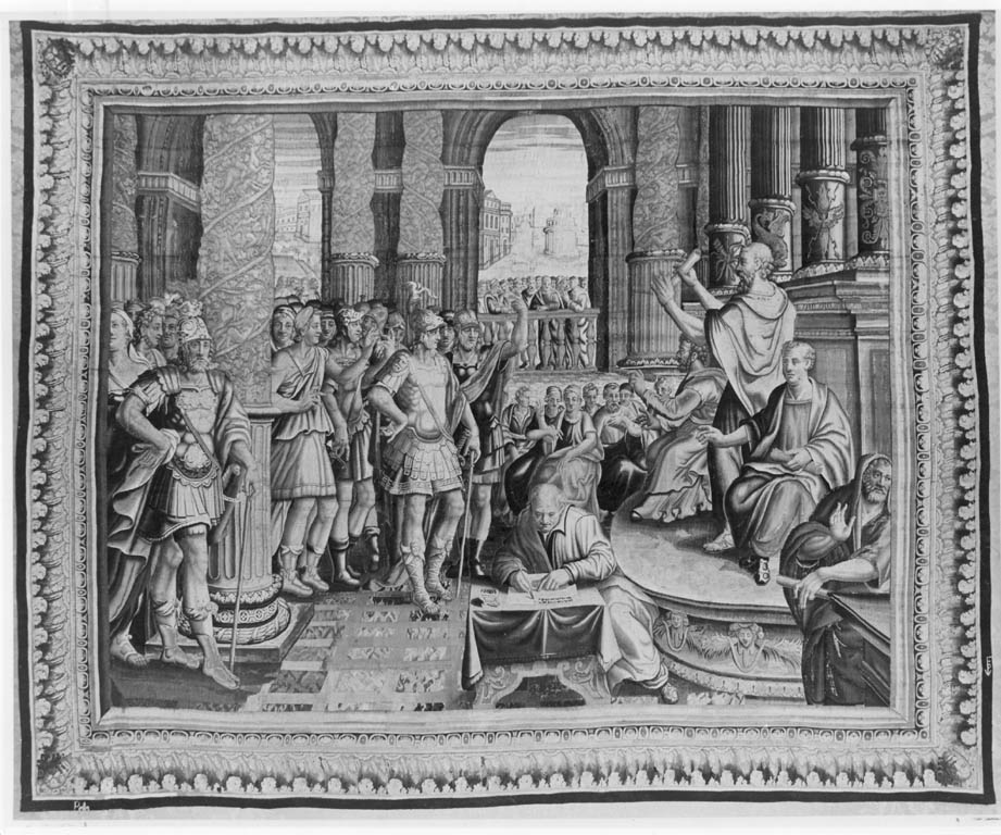 Personaggi: Scipione Africano. Figure: folla. Interno: sala con colonne tortili. Guerrieri