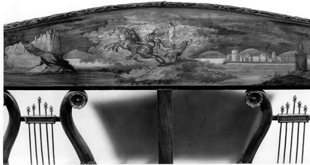 Divanetto in stile Luigi XVI, con sei gambe, sedile coperto in seta e schienale intagliato a doppia lira e dipinto con la raffigurazione di Cupido su un carro trainato da due cavalli in un paesaggio marino