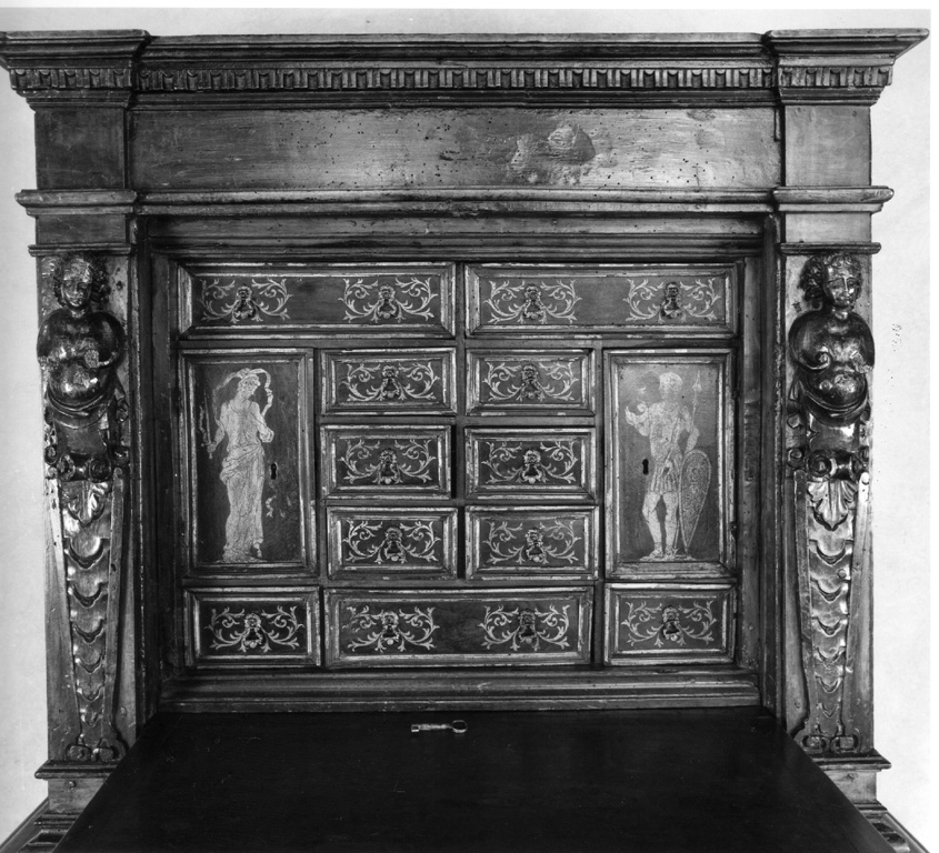 credenza a due corpi. Corpo inferiore: zoccolo modanato, due ante suddivise da tre lesene scanalate e rudentate, cornice modanata. Corpo superiore: ai lati, pilastrini con erma, inquadranti anta quadripartita da due cornici, all'incrocio delle quali è uno stemma entro tondo. Conclude in alto una trabeazione