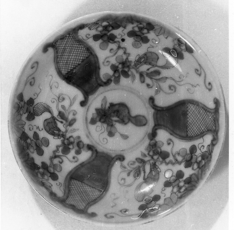 a parete curva su breve piede ad anello, decorato in blu cobalto sotto coperta e smalti rosso e oro sopra coperta, con la raffigurazione di elementi geometrici simili a vasi e di roditori rossi che si avventano su pampini vegetali