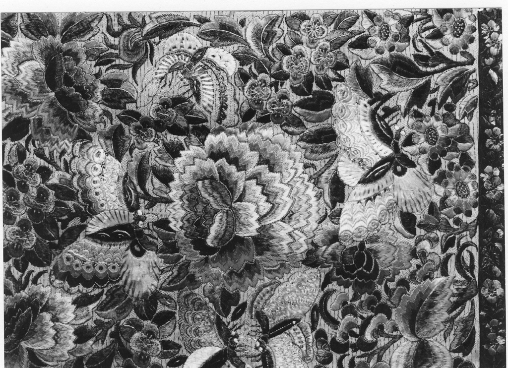 Pannello formato da due pezzi seta ricamata in sete colorate, uniti insieme con un bordo ricamato su fondo scuro a peonie e piccoli fiori. All'interno un'altra striscia a disegno ancor più minuto limita il pannello decorato da un fitto intreccio di fiori e farfalle che viene chiaramente ad interrompersi ad una determinata altezza; il secondo pannello presenta una decorazione di steli leggeri con piccoli fiori circondati dal motivo di base che vanno a chiudersi come le parti di un ventaglio