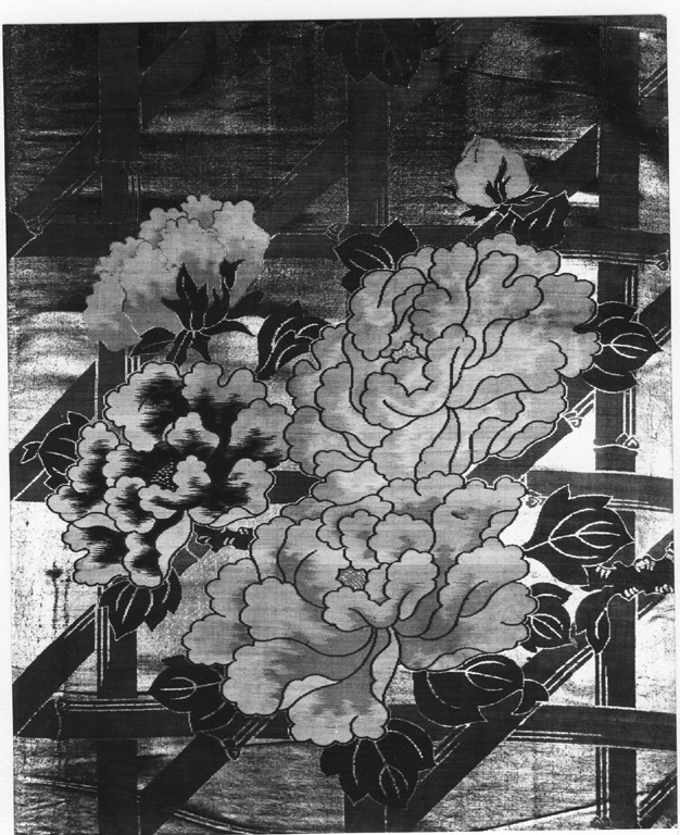 Pannello composto da due teli di lampasso in seta, decorato in oro e sete colorate per trame lanciate legate in diagonale, con parti broccate. Su una parete di bambù intrecciati, con sfondo in oro, mazzi di peonie a colori alternati in vivace gamma cromatica. La decorazione è profilata in oro e in colore. Toni di viola, bianco, rosa, verde