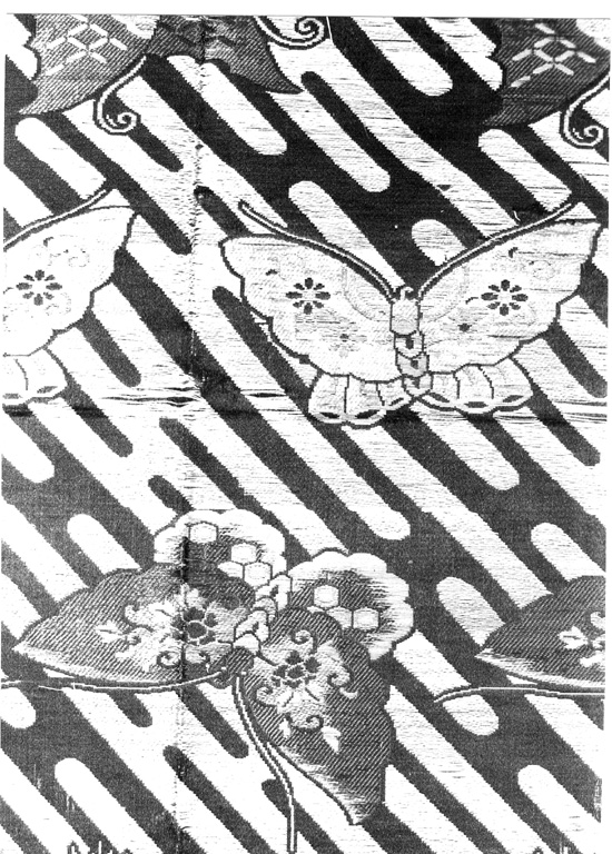 Telo di lampasso broccato, fondo raso, decorato per trame flottanti e legate in diagonale. Sul fondo a linee oblique in bianco e grigio una serie di farfalle viste di profilo e di fronte, volte verso il basso e verso l'alto in vari toni di colore