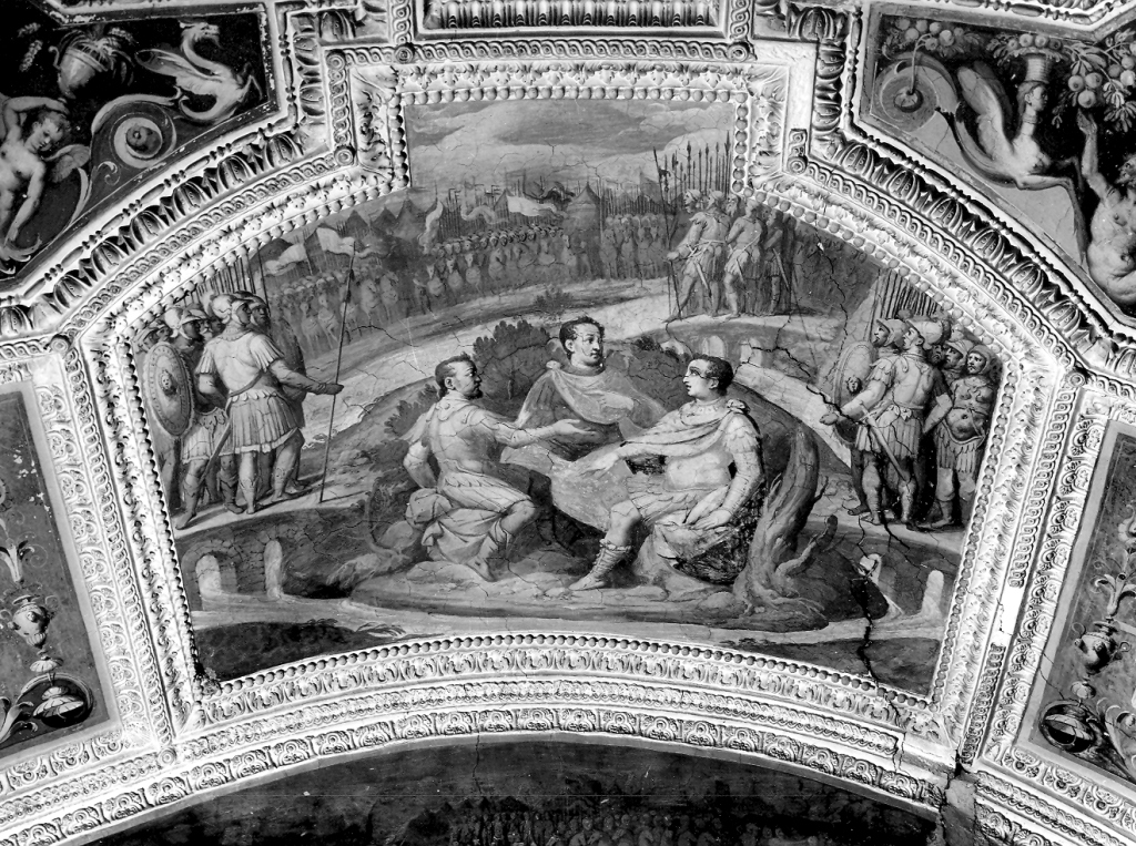 • NOTIZIE STORICO CRITICHE L'affresco è citato dal Tomassetti (1913) come riferibile agli Zuccari. Egli propone che i tre triunviri raffigurino tre colonnesi dell'epoca. Essi allora potrebbero essere identificati con i fratelli Stefano e Alessandro, e il più giovane a destra, il figlio dell'ultimo, Sciarra, probabile committente del ciclo pittorico. L'artista armonizza i modi tardo manieristici con un gusto classico della composizione