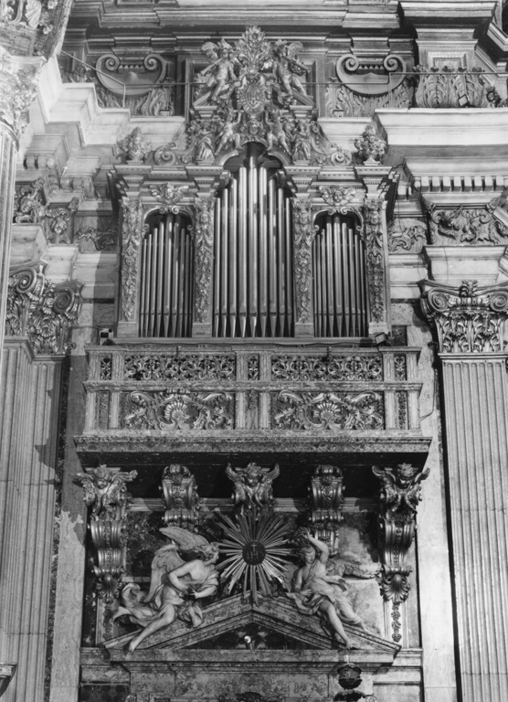 Cinque mensole, di cui tre caratterizzate da cherubini, sostengono il palco decorato su due registri sovrapposti con un motivo a volute e girali d'acanto. Ai lati dei pilastrini lisci