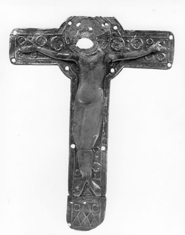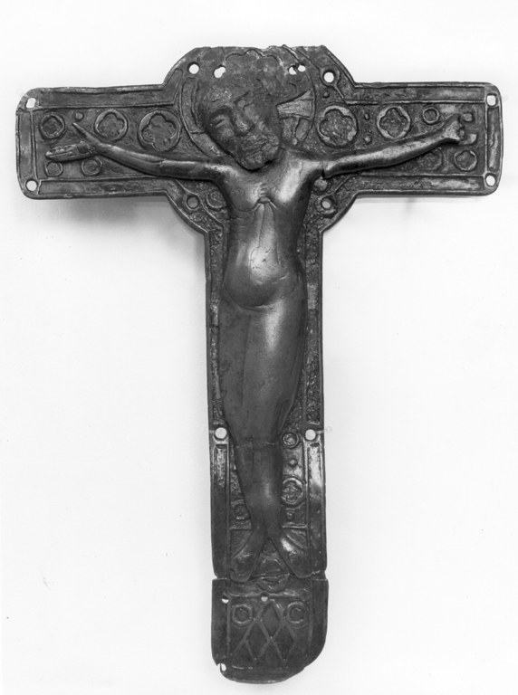 decorato sulla croce con elementi quadrilobati di varie misure ma simili sulla forma, propone la raffigurazione del " Cristo Morto"