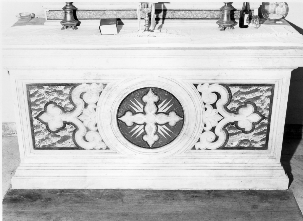 mensa a parallelepipedo con decorazione sulla fronte e croce con bracci vegetali raggiati entro clipeo. Ai lati sono due stemmi