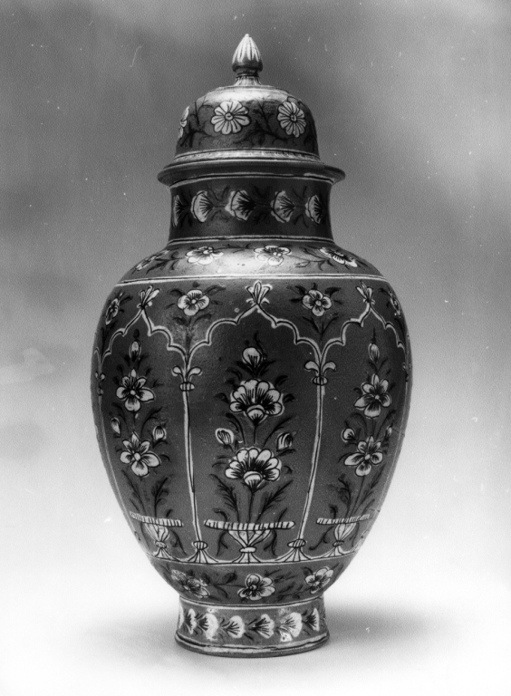 corpo ovoidale, piede e collo cilindrico con orlo estroflesso; coperchio con forma a cupola con perno per la presa; decorazione distribuita sul corpo del vaso entro pannelli di ispirazione architettonica (archi polilobati), entro fasce orizzontali; motivi decorativi bianchi e azzurri profilati di blu su fondo rosso mattone