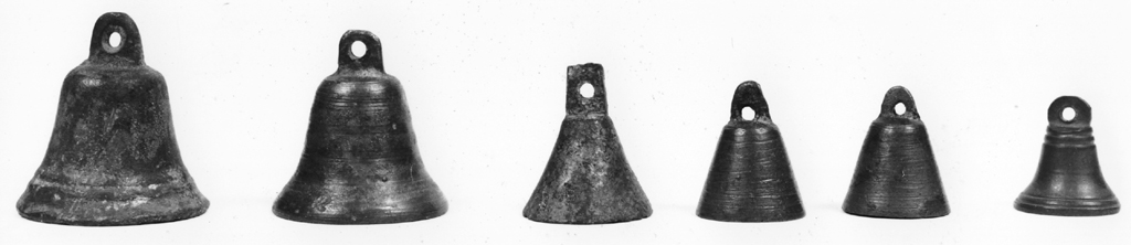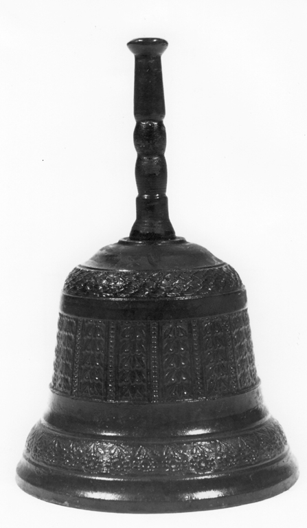 la superficie esterna della campanella presenta profonde abrasioni ed ha una forma molto lineare anche nel manico dalla forma quadrangolare con un ampio foro al centro