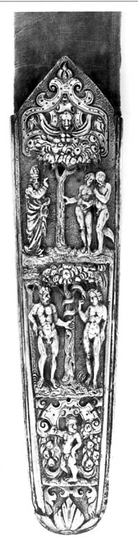 fodero ricoperto di velluto color ocra, con placca in argento sbalzato alla bocca, con raffigurazione di mascheroni, figure femminili e Adamo ed Eva nel Paradiso Terrestre. Il puntale è decorato da una placca in argento sbalzato raffigurante la scena del Peccato Originale