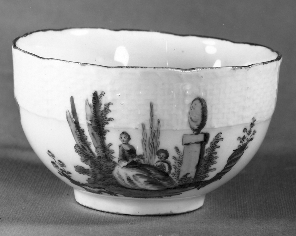 tazza su basso piede circolare, con ansa a "sterno di pollo", decorata lungo il bordo con una fascia a rilievo, a graticcio e con fiori dipinti all'interno e all'esterno e con scena con dama e gentiluomo accanto con cippo e urna ovoidale
