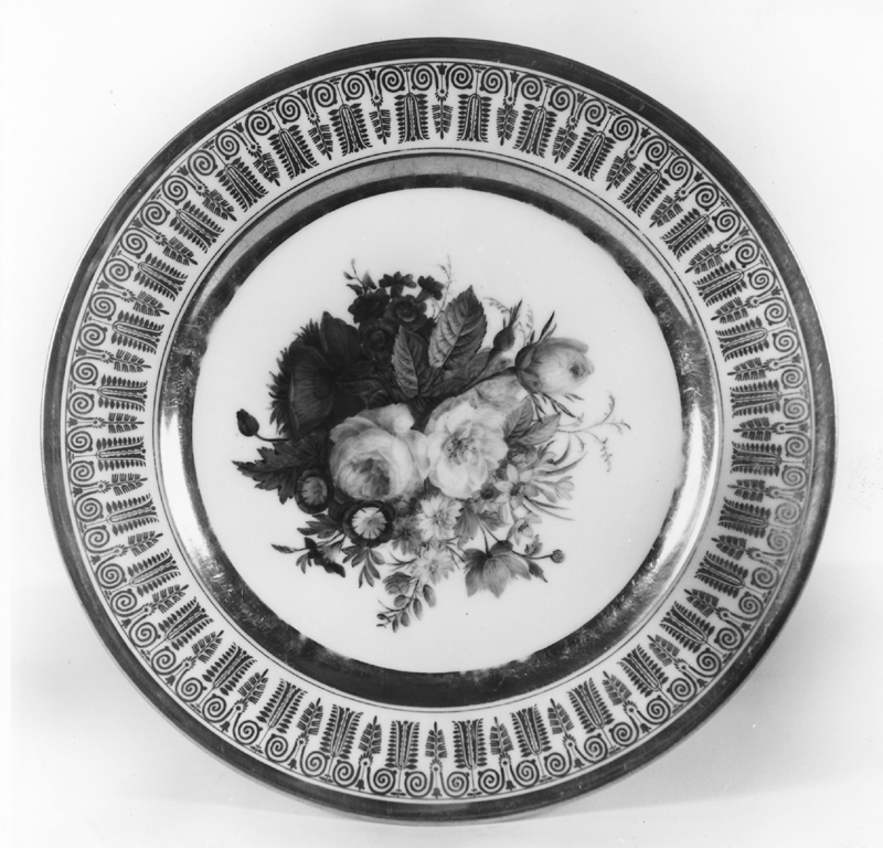 tesa circolare decorata da fregio a spirali e palmette stilizzate in oro su fondo bianco; fondo decorato da un mazzo di fiori policromi