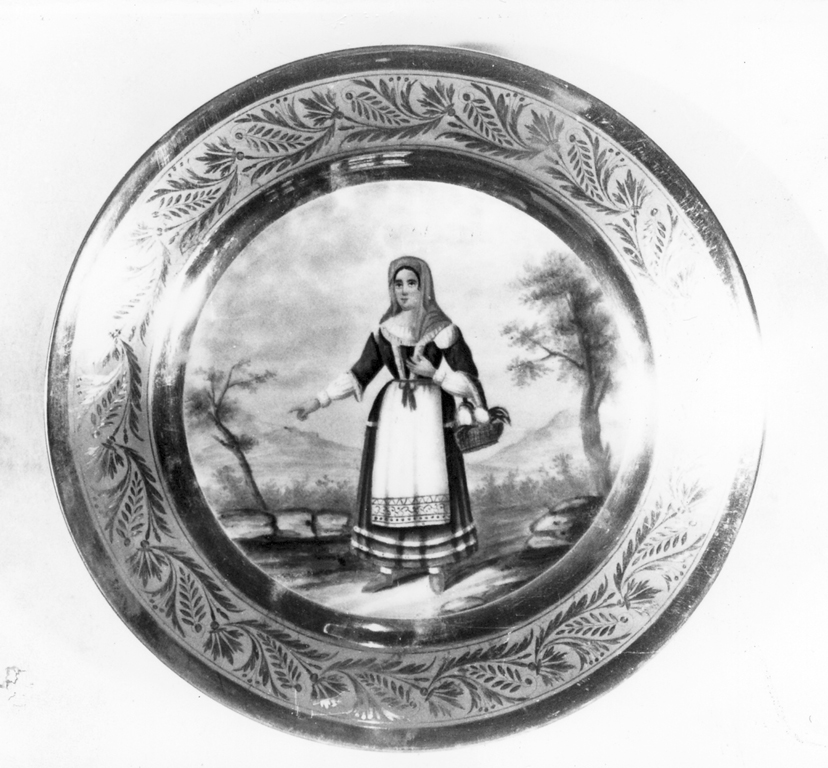 - NOTIZIE STORICO CRITICHE la serie di piatti fu realizzata su modello del servizio delle "Vestiture del Regno", eseguito dal 1784 per volere di Ferdinando IV. Le raffigurazioni dei costumi indossati dalle genti del Regno delle Due Sicilie derivano da una serie di disegni di Giacomo Milani, incisa su rame da Raffaele Aloja tra il 1794 e il 1799. Alcuni pezzi sono firmati da Francesco Nardone, decoratore attivo tra il 1826 e il 1860 nell'atelier di Raffaele Giovine a Napoli