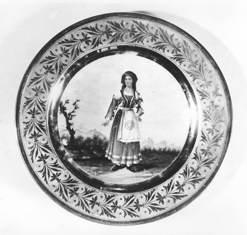 piatto circolare con tesa dorata integralmente decorata a motivo vegetale; al centro, raffigurazione di donna in costume popolare in un paesaggio