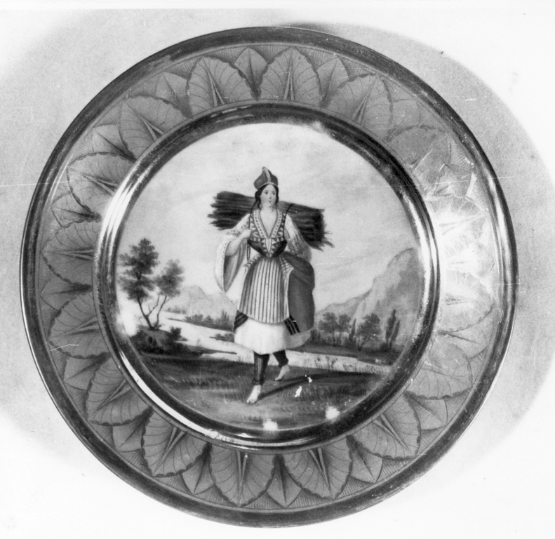 piatto circolare con tesa dorata integralmente decorata a motivo a foglie; al centro, raffigurazione di donna in costume popolare con fascina sulle spalle in un paesggio