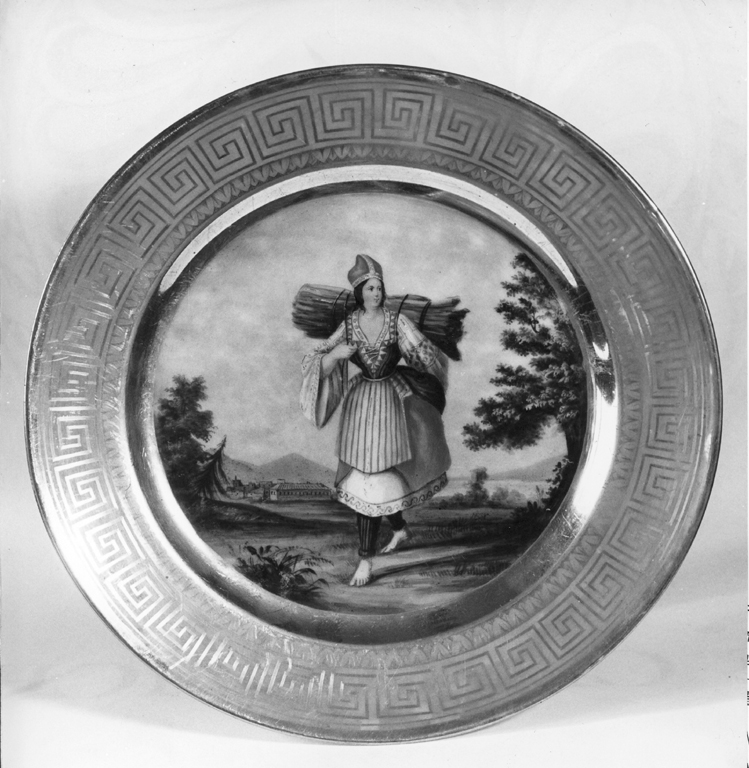 piatto circolare con tesa dorata integralmente decorata a motivo a graca; al centro, raffigurazione di donna in costume popolare con fascina sulla schiena in un paesaggio