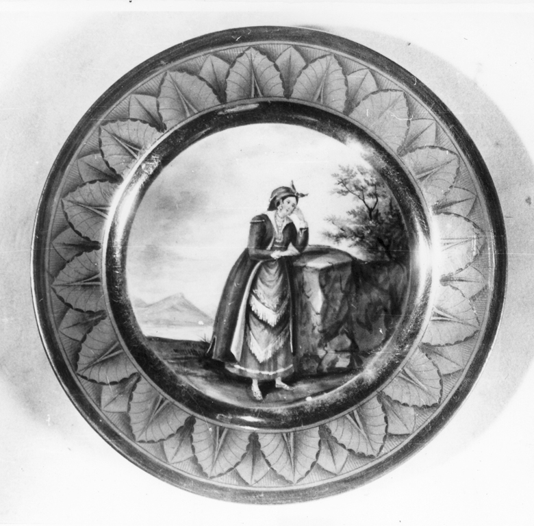 piatto circolare con tesa dorata integralmente decorata a motivo a foglie; al centro, raffigurazione di donna in costume popolare col gomito poggiato su una roccia in un paesaggio