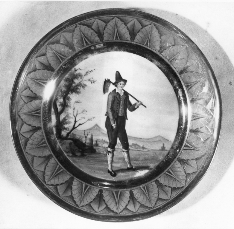 piatto circolare con tesa dorata integralmente decorata a motivo a foglie; al centro, raffigurazione di uomo con zappa sulla spalla in un paesaggio